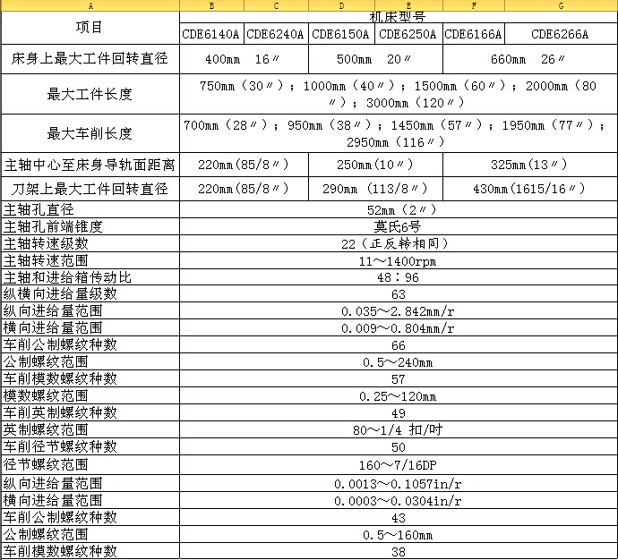 CDE-A 系列普通車床是具有宜人性的新一代普通車床,外觀采用流行的直角平面造型,前后腿寬大。床身經(jīng)過(guò)了表面高頻淬火、磨削加工,淬火硬度G50。床頭箱齒輪經(jīng)過(guò)了齒部高頻淬火、精密磨齒加工,齒輪精度可達(dá)7級(jí)。本系列有CDE6140A、CDE6240A、CDE6150A、CDE6250A、CDE6166A和CDE6266A等型號(hào)的普通車床
